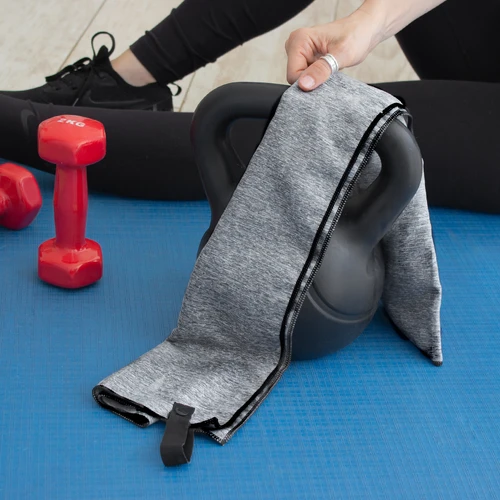 80 x 40 cm. Microfibra. Toalla de microfibra de secado rápido. Poliéster (200 g x m2) catiónico doble cara. Cinta negra que permite enrollar la toalla y aplicar logo.