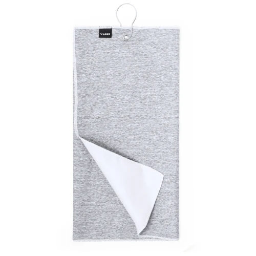 Toalla de golf fabricada en RPET, absorbente y suave con dimensiones de 40x60 cm. En el centro, incorpora una argolla reforzada y un mosquetón de acople, ambos elaborados en acero inox. Con logotipo RPET en etiqueta.El material RPET se elabora a partir de plástico reciclado, para así fomentar la reutilización de residuos plásticos y ayudar a la sostenibilidad del planeta.