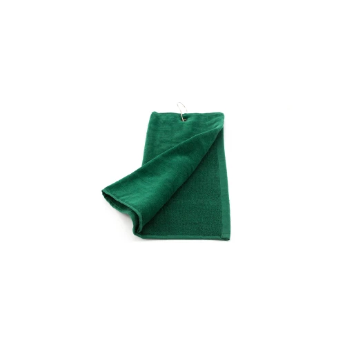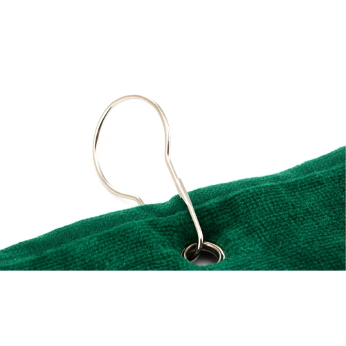 Toalla de golf de 40x50cm en absorbente y suave algodón de alta calidad de 650g/m2. Con argolla reforzada y mosquetón de acople, ambos de acero inox.