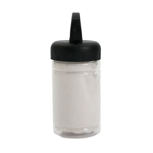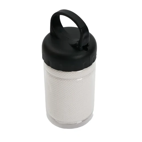 Toalla con estuche portátil. Fabricada en poliéster, PET y polipropileno. Cuenta con toalla de secado rápido (30 × 80 cm) y envase plástico con gancho incorporado para colgar o transportar fácilmente. Es ideal para entrenamientos, actividades al aire libre o viajes, gracias a su tamaño compacto y capacidad de secado rápido.