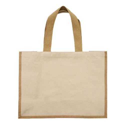 Tote bag fabricada en canvas de 320gsm (10 oz) combinada con yute laminado. Ideal para quienes buscan una bolsa amplia y resistente para transportar compras, libros u otros objetos de forma práctica y ecológica. Medidas: 35 x 46 x 19 cm. ReUseMe