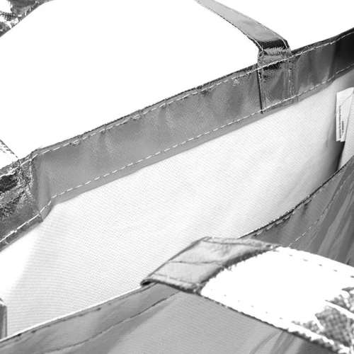 Realizada en Nonwoven Laminated Metallic. Manijas reforzadas. Capacidad: 14.5 Lt. Medidas: 36 x 40 x 10 cm.