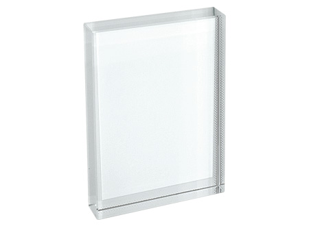 Trofeo rectangular de Cristal sólido para Sublimación. Presentación en caja de cartón azul con cuna amarilla.