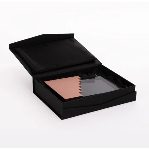 Elegante Trofeo de Cristal biselado con base metálica color cobre, modelo "Ladder". Presentación en caja de cartón forrado negro con cierre imantado, interior acolchado de espuma y tela poliéster satinado negro, con troquel.