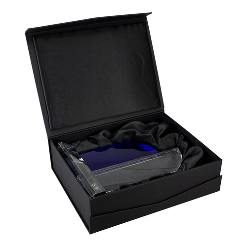 Deluxe Trofeo grande de Cristal modelo "Catedral" con aplicación de cristal-color. Presentación en caja de cartón forrado negro.