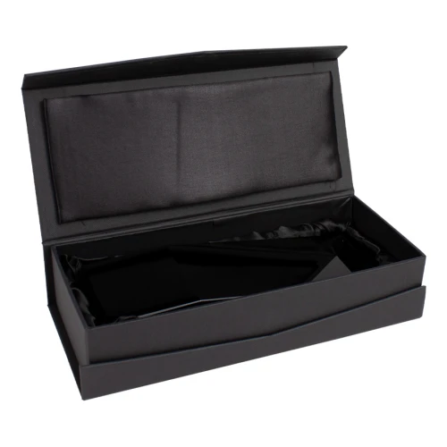 Elegante Trofeo de Cristal Negro, modelo "Azabache". Presentación en caja de cartón forrado negro con cierre imantado, interior acolchado de espuma y tela poliéster satinado negro, con troquel.