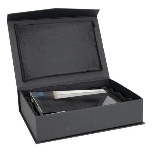 Elegante Trofeo Galvano de Cristal modelo "Syntec". Presentación en caja de cartón forrado negro con cierre imantado, interior acolchado de espuma y tela poliéster satinado negro, con troquel.