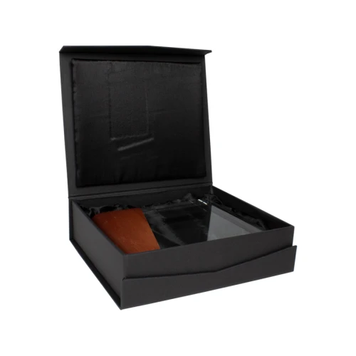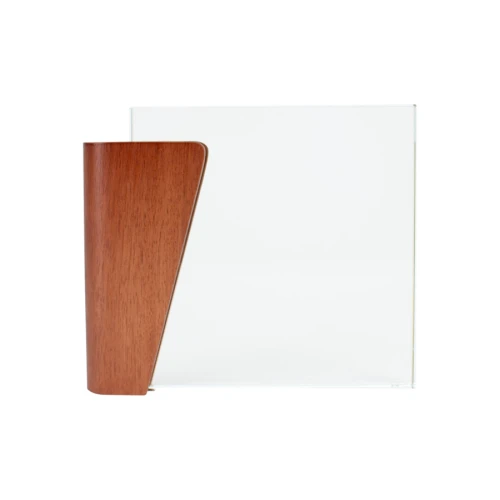 Elegante Trofeo modelo "Lewis", en madera barnizada y cristal. Presentación en caja de cartón forrado negro con cierre imantado, interior acolchado de espuma y tela poliéster satinado negro, con troquel.
