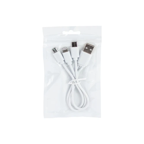 Connect Multicargador 4-en-1 con cables plásticos TPE engomado. Multi-cables con terminales de carga USB / Micro-USB / i-phone (Lightning) / Type C. Compatible con dispositivos Android, Apple y Type C. Presentación en elegante bolsa OPP con orificio para colgador de ganchera. Producto con aprobación CE, ROHS, FC.