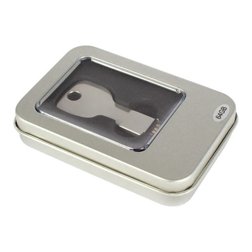 USB Pen Drive 2.0 con 64GB de capacidad, con forma de llave metálica. Ideal para llevar en tu llavero personal. Presentación en caja metálica pequeña con ventana.