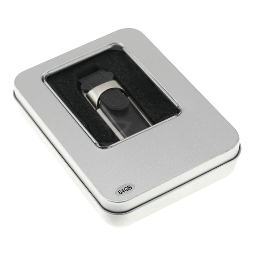 USB Pendrive 2.0 memoria de 64GB, de Eco-cuero. Presentación en elegante estuche de aluminio con ventana, dentro de cuna de esponja EVA negra.