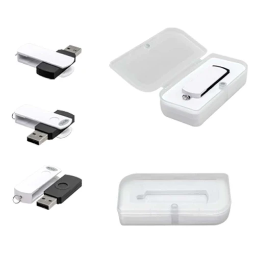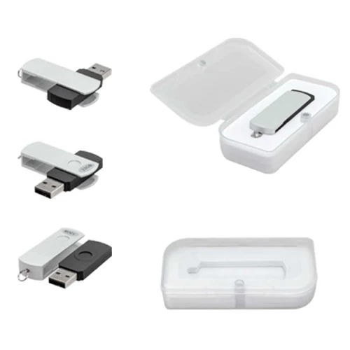 USB 2.0 Pendrive con carcaza metálica de giro en color metalizado y cuerpo de silicona negro, de 32 GB de capacidad. Incluye pequeña argolla metálica para colgar. Presentación en caja de PVC traslúcido.
