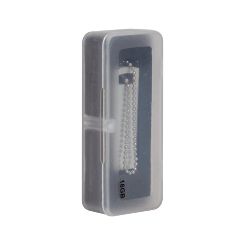 USB Pendrive 2.0 de 16GB de capacidad con carcasa giratoria y anillo colgante de acero inoxidable. Presentación en estuche de PVC translúcido empavonado, con cuna de EVA negra y cierre imantado.