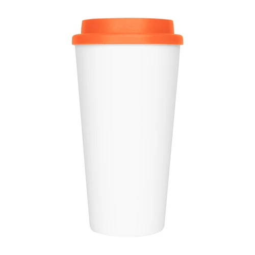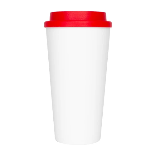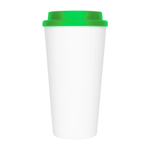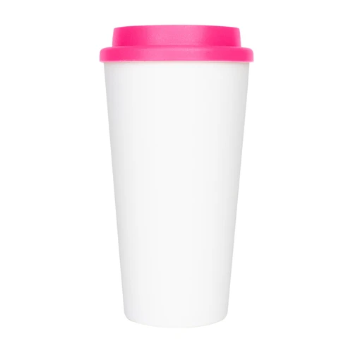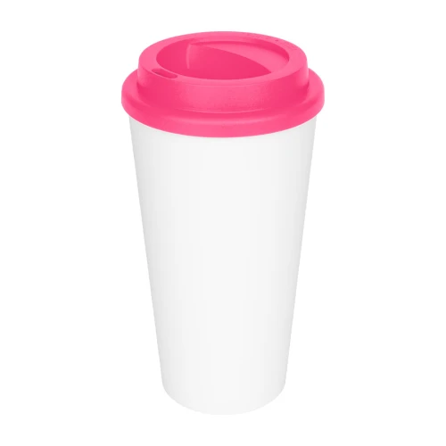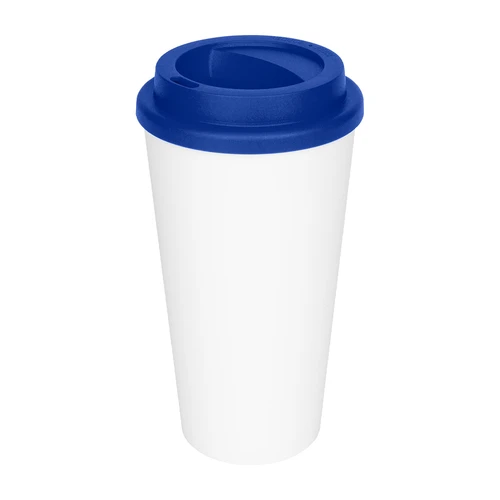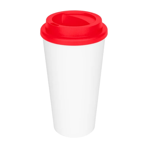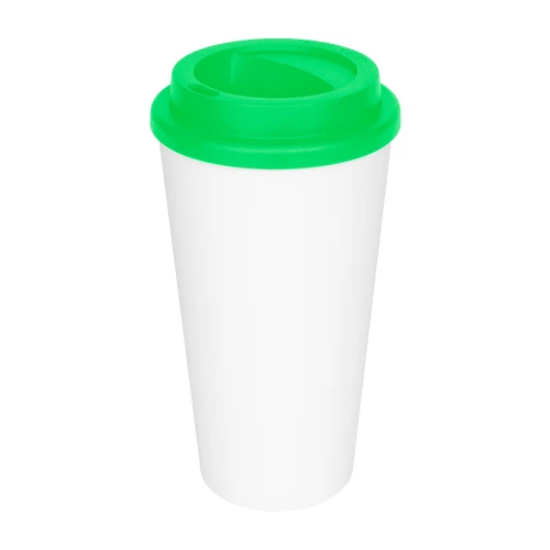 Vaso de polipropileno (PP) blanco doble pared, para líquidos fríos y tibios, con tapa rosca de color. Cuerpo cónico liso, para amplia impresión de logo. Producto BPA FREE, para el contacto con líquidos y alimentos. Capacidad 500ml. Presentación en caja de cartón color blanco.