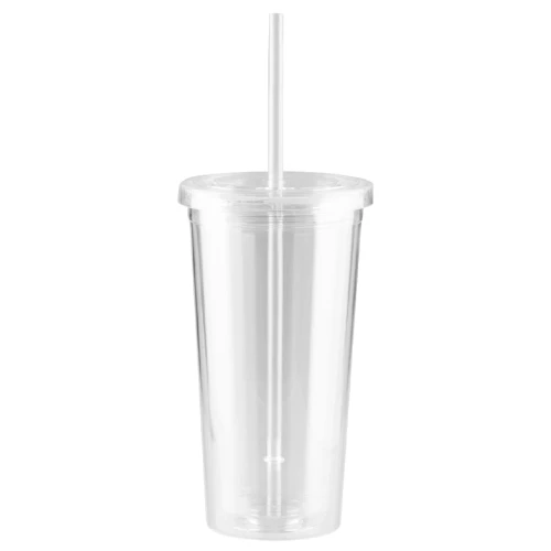 Vaso cónico de plástico PS + PP translúcido, con doble pared aislante para líquidos calientes, viene con tapa y bombilla rígida. Capacidad 600ml. Cada unidad en su caja de cartón blanco. Producto libre de BPA.