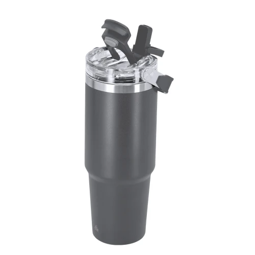 Vaso térmico con 900 ml de capacidad con doble pared. Fabricado en Acero Inoxidable Reciclado. Cuenta con doble sistema de bebida: orificio con cierre hermético y pajita integrada, adaptándose a las preferencias de uso. Con tapa de sistema de sellado hermético. Incluye práctica asa de transporte, ideal para transportarlo fácilmente en cualquier situación. Libre de BPA. Con distintivo de Acero Inoxidable Reciclado.