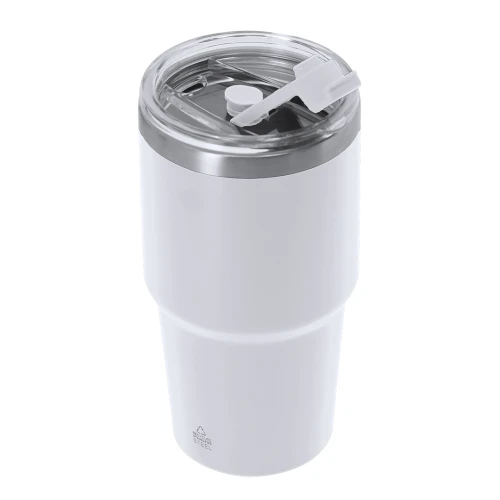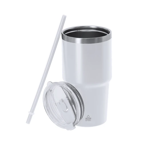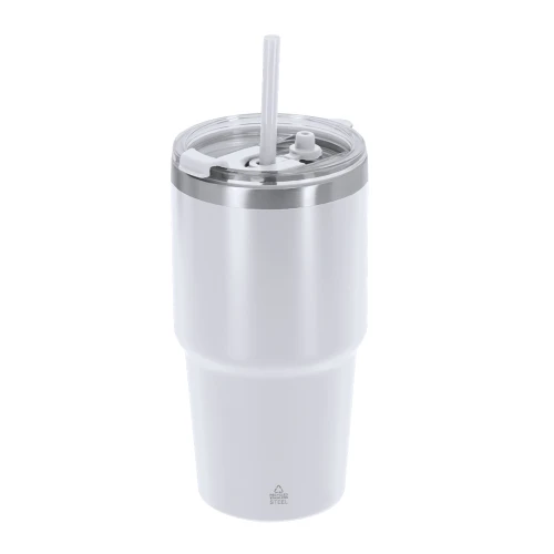 Vaso térmico fabricado en acero inox reciclado de doble pared y 650 ml de capacidad. Cuenta con doble sistema de bebida: orificio con cierre hermético y pajita integrada, adaptándose a las preferencias de uso. Cuenta con tapón para cierre hermético cuando se extrae la pajita. Es ideal para tener en tu escritorio, mesa o en cualquier superficie donde disfrutar tranquilamente de tu bebida favorita. Con logotipo Acero Inox Reciclado.